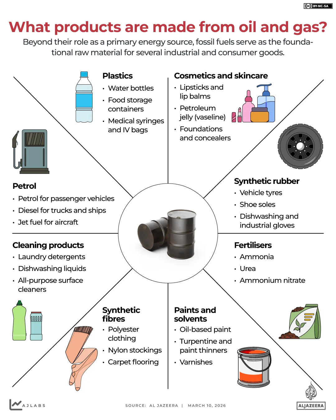 Сырая нефть также является скрытым ингредиентом в синтетических тканях, таких как полиэстер, нейлон и акрил, которые присутствуют во всем: от спортивной одежды до ковров. Это также лежит в основе косметической промышленности, производящей такие продукты, как вазелин, помады и консилеры.