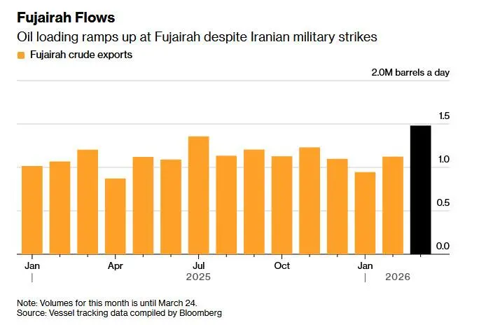 По данным Bloomberg, трейдеры вывезли 404 000 баррелей топлива из резервуаров Фуджейры за неделю до 23 марта, что представляет собой снижение запасов на 2,8%, согласно данным из зоны нефтяной промышленности Фуджейры и составленным Platts, подразделением S&P Global Inc. В то время как некоторые операторы терминалов пытаются опорожнить свои резервуары, чтобы снизить риски пожара, другие неохотно загружают их, опасаясь, что это сделает их целью, по словам людей, знакомых с операциями.
