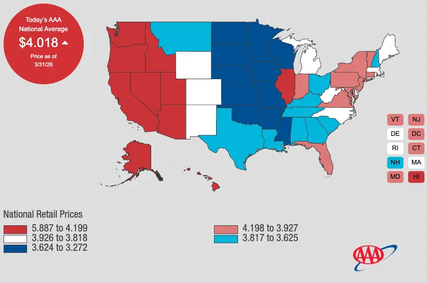 Последние данные ААА показывают, что цены на бензин по всей стране в понедельник превысили 4 доллара за галлон, что на 35% выше для бензина Regular 87 на заправке и является самым большим ценовым скачком за всю историю наблюдений, начиная с 2004 года.